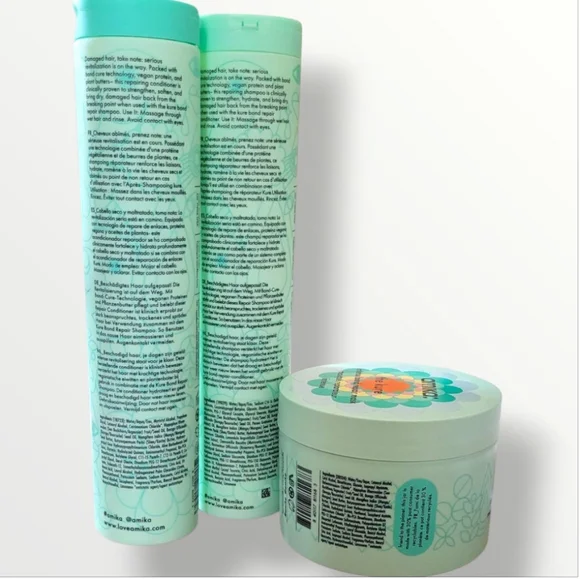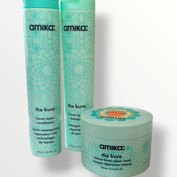 Amika The Kure bond repair shampoo, conditioner, and intense bond repair mask set. This luxurious hair care set is specially formulated to repair and nourish damaged or weakened hair, leaving it stronger, smoother, and healthier. Perfect for anyone looking to restore shine to their hair, this set includes key products designed to target damage and boost hair vitality.The amika Play Your Strength set includes a range of essential products, such as strengthening shampoo, conditioner, and a hair treatment mask, all formulated with bond-repair technology to fortify and protect your strands. Infused with nourishing ingredients like sea buckthorn, these products help repair split ends, reduce breakage, and improve overall hair texture, making your hair look and feel its best.Brand new. $98MSRP. May come in a box with physical defects, some are flawless, no damage to products.