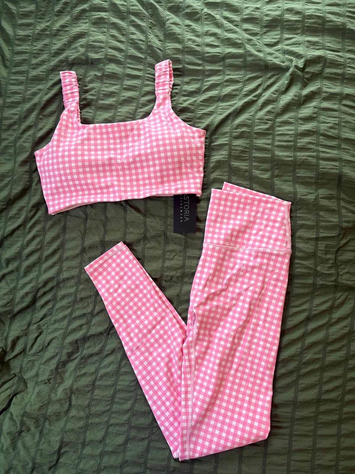 ASTORIA LUXE BALANCE RUCHED SPORTS CROP - PINK GINGHAM (Large) very small spot that I circled. I am not sure if it came like that or what. You can’t notice it unless your face is right up against material. Did not notice it until I took pictures of set.