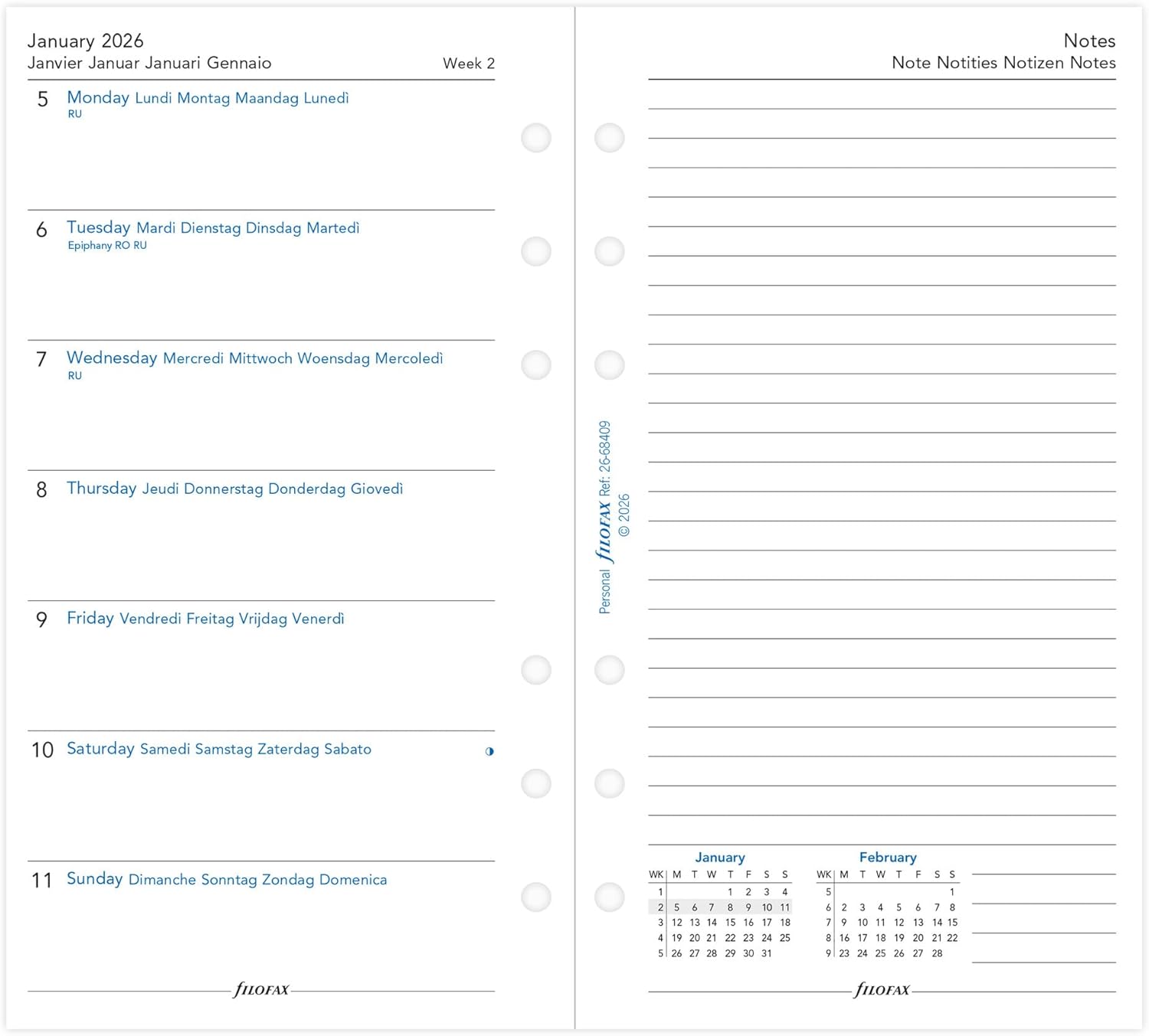 This Filofax Personal 2026 diary refill 26-68409 is a week per page with facing notes format, printed in English, French, German, Dutch and Italian on white paper. The week starts on Monday and runs from January to December 2026. Paper size 95mm x 171mm, drilled with six round holes.