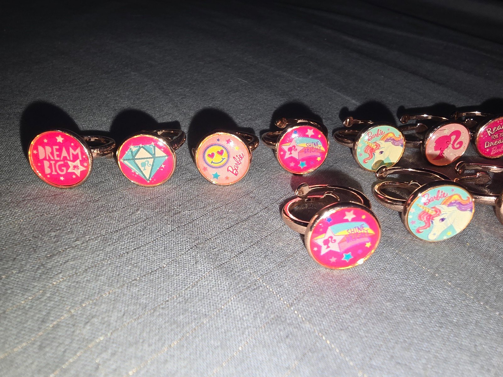 This listing includes all the rings pictured, which includes 12 kids adjustable rings and 3 adult non-adjustable rings. This was an exclusive collection from 2017 or 2018 (I believe) from Fragrant Jewels Barbie bath bombs and candles. The adjustment ones are discolored a bit from age and maybe the storage but they were kept in a jewelry box so not completely sure. One also has some scratches as shown. But the adult rings range from size 6 ro size 8. Just message if you have any questions. I am open to parting out for reasonable prices. Thank you for looking.