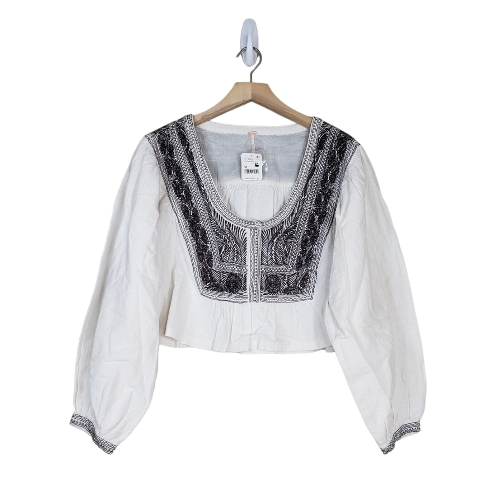 Free People Womens M Iggie Embroidered Blouse in Ivory/Black Bean