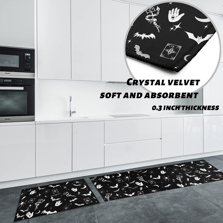 Black Gothic Kitchen Rugs Set of 2: The black kitchen rug set of 2 pieces measures- 17x30 and 17x48 Inch. This gothic kitchen floor mat is printed with spiders, moons, bats, tarot cards, roses, snakes, etc. Suitable as goth kitchen decor and accessories, gothic rugs for kitchen, kitchen gothic theme decor sets, gothic home decor, black kitchen rugs, Black and white kitchen mat rug.