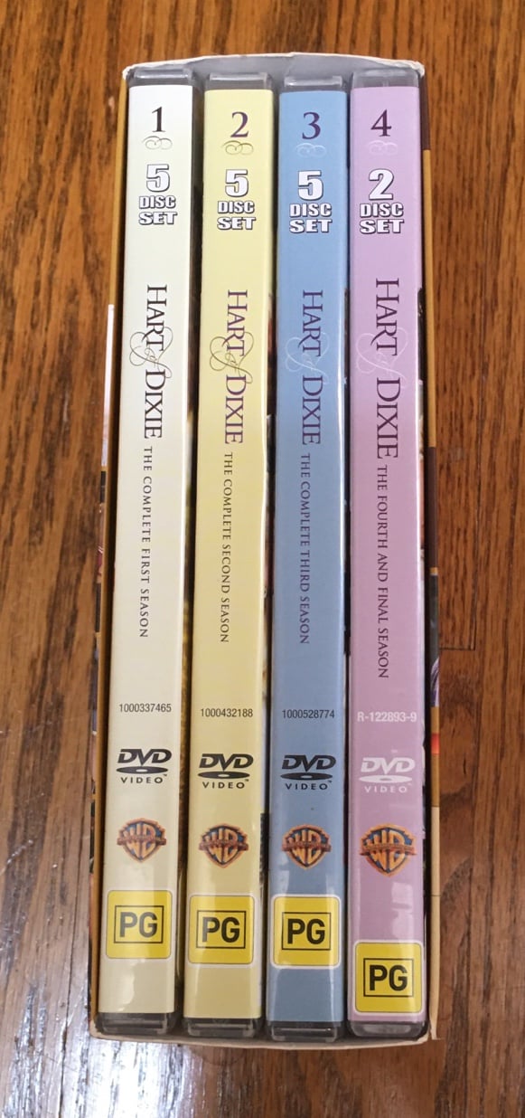 Preowned full set of the show Hart of Dixie. Includes all discs for all four seasons. It is for region 4. The discs are mainly in very good condition, but some do have some fogginess and/or marks. They worked when I last played them, but I no longer have a DVD player for region 4. Purchasing is an acceptance of all of these things.