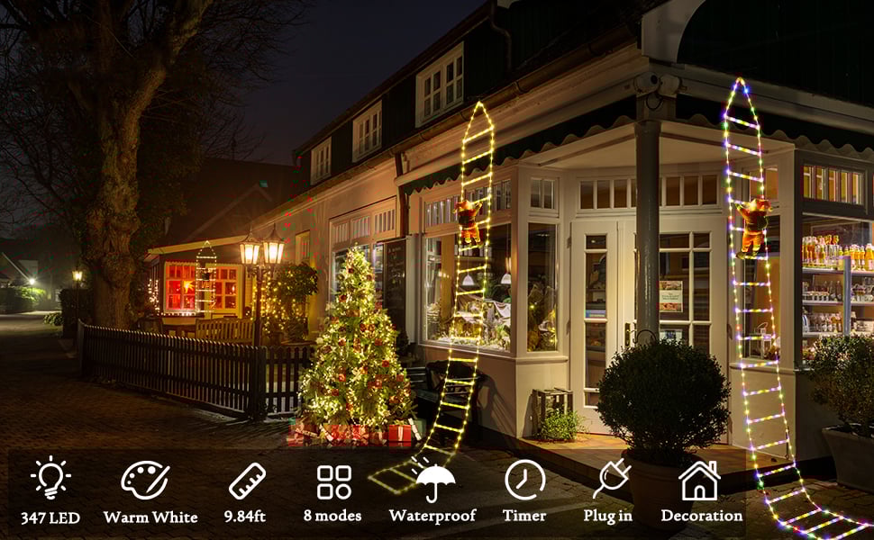 10ft height ladder lights with 347pcs warm white LED light bulbs, 10ft lead wire, 11.8in Santa.
