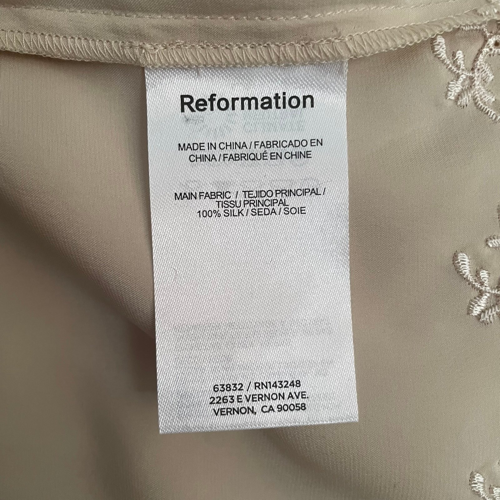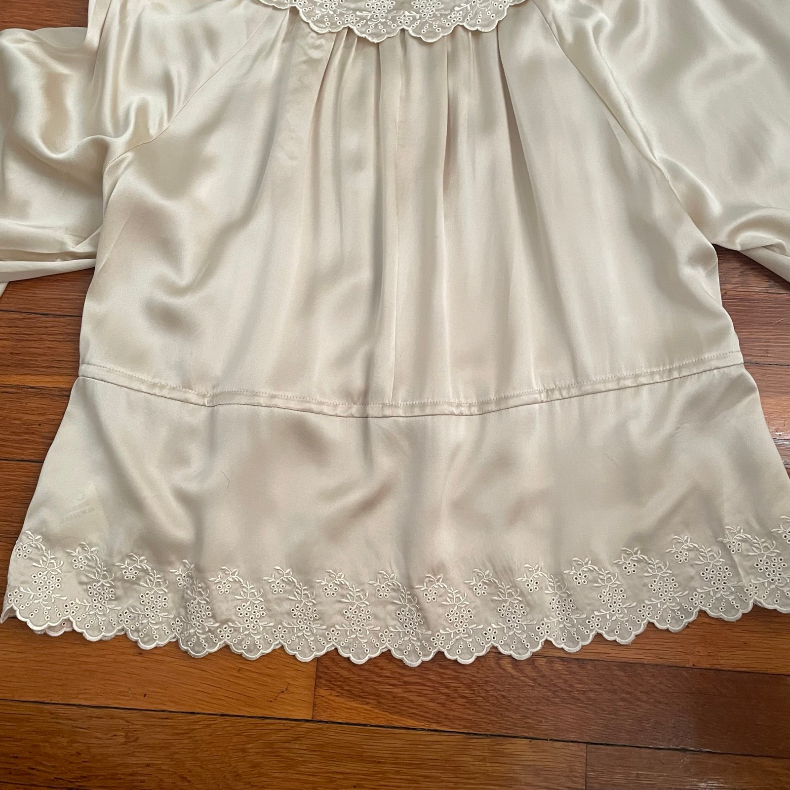 Charming eyelet embroidery decorates the scalloped trim of this blousy silk-satin top detailed with dainty ties and flared cuffs for a softly elegant look.