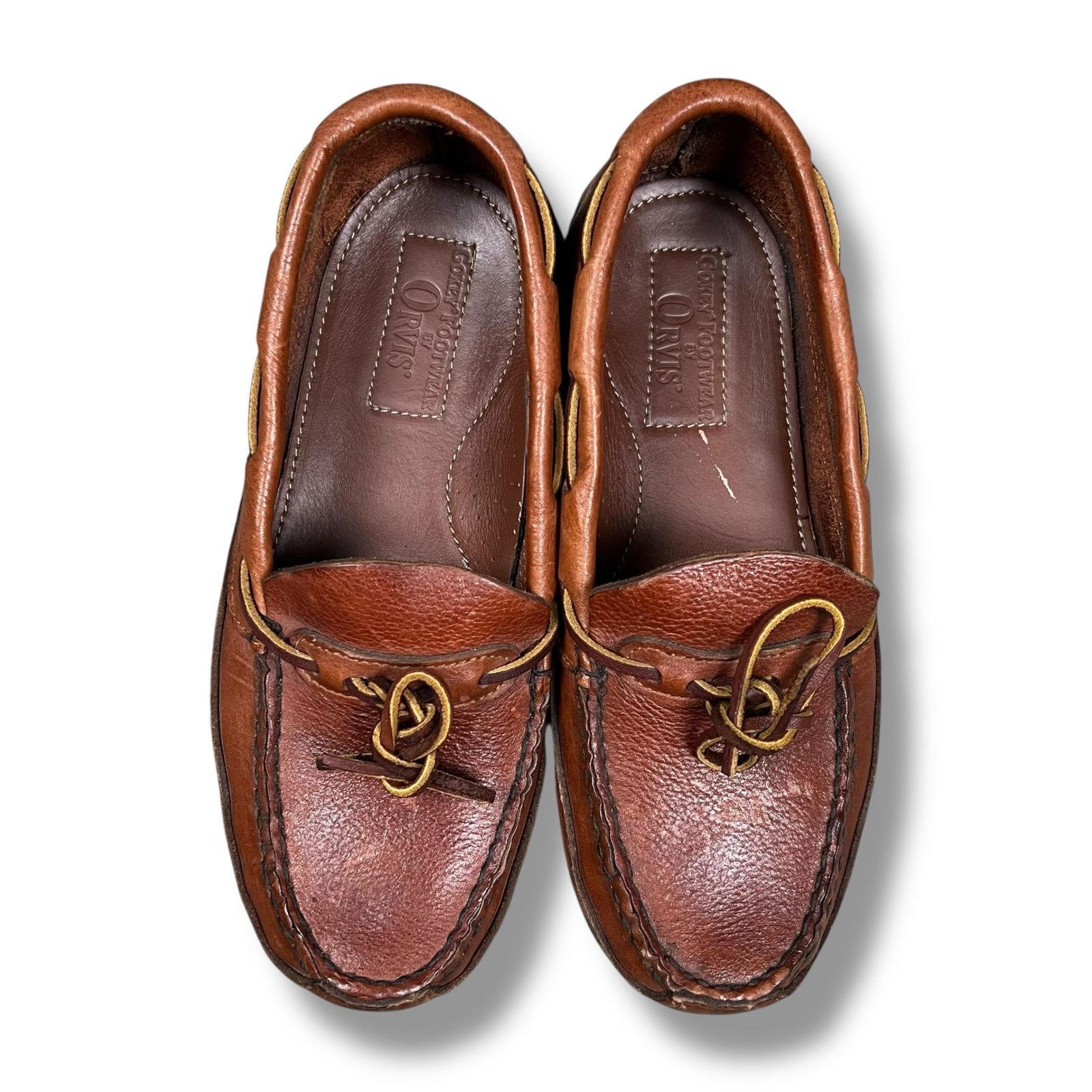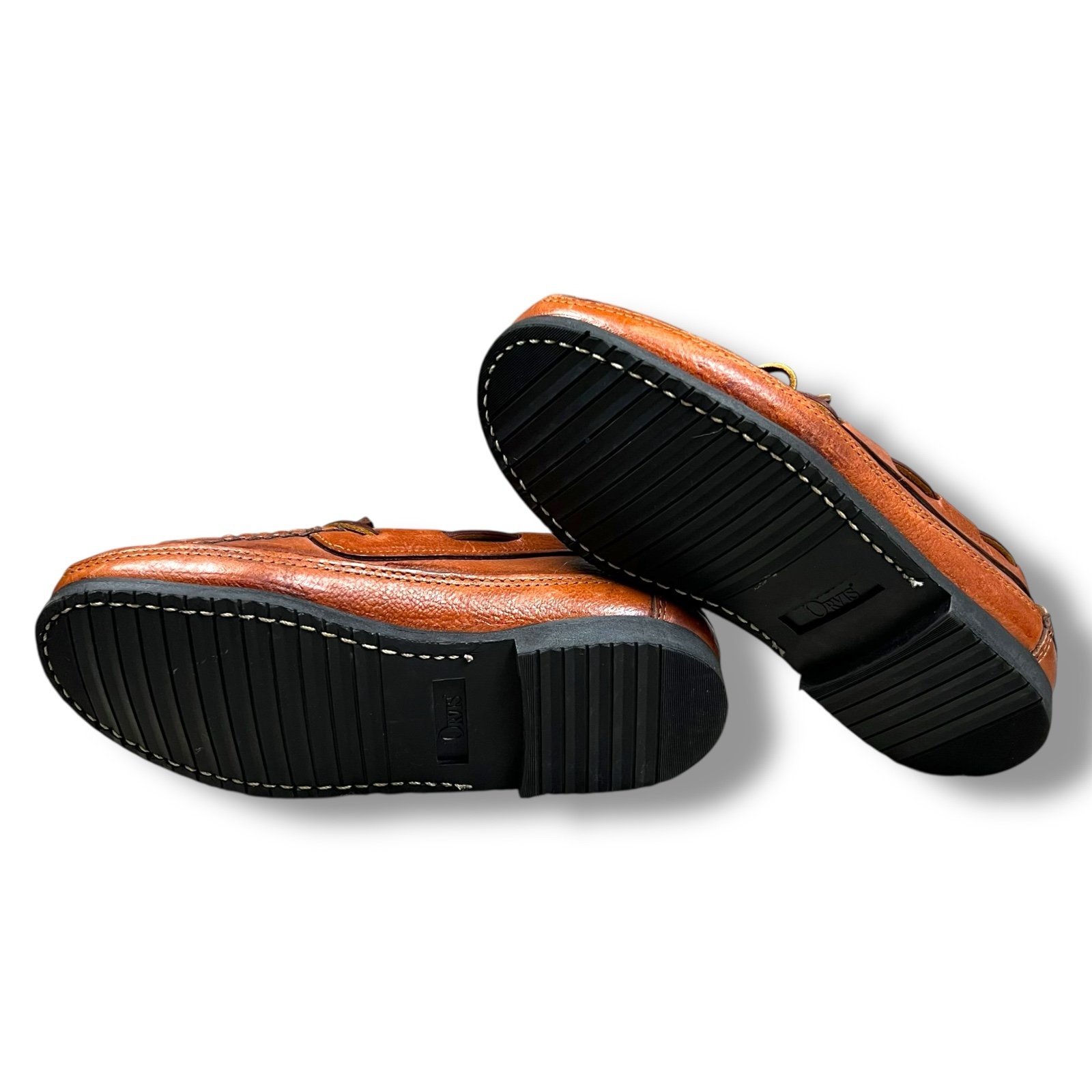 The ORVIS by GOKEY Lug Sole Camp Moc Bullhide Leather Moccasins Loafers are a stylish and rugged pair of shoes perfect for casual, travel, or workwear occasions. Made with durable leather outsole material and lined with leather, these moccasins offer comfort and cushioning for all-day wear. Featuring a round toe shape, lace-up closure, and solid brown color, these limited edition loafers are a classic addition to any man's shoe collection. Crafted by the renowned brand Gokey, these moccasins are ideal for outdoor activities and add a touch of preppy sophistication to any outfit. Made in the USA, these shoes are a timeless piece for the modern man.