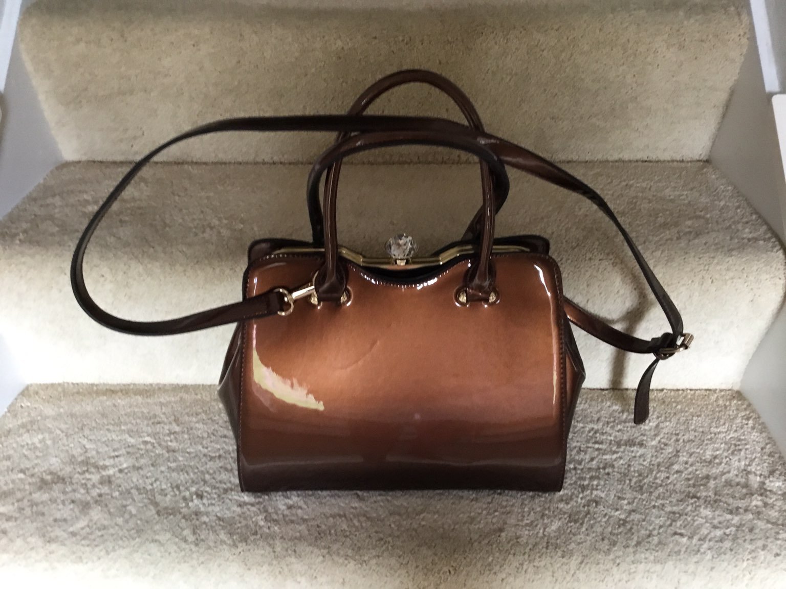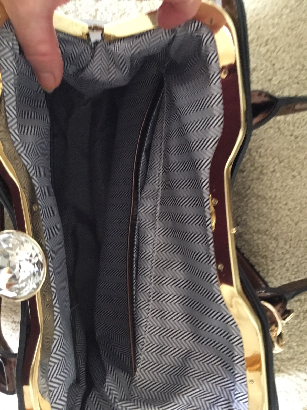 Made to look Vintage. Never used. Measures at 13”wide by 11”tall. Lined zipper pocket on one side then a open divided pocket on the other. Closure is a 1 1/2’ faux round brilliant diamond. Color ranges in from coppers you golds. Not my style.