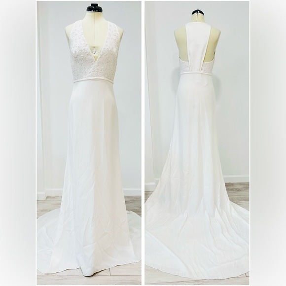 Gabriella is a crepe column gown with all-over sequin embellishment at the bodice and a modest semi-open back.