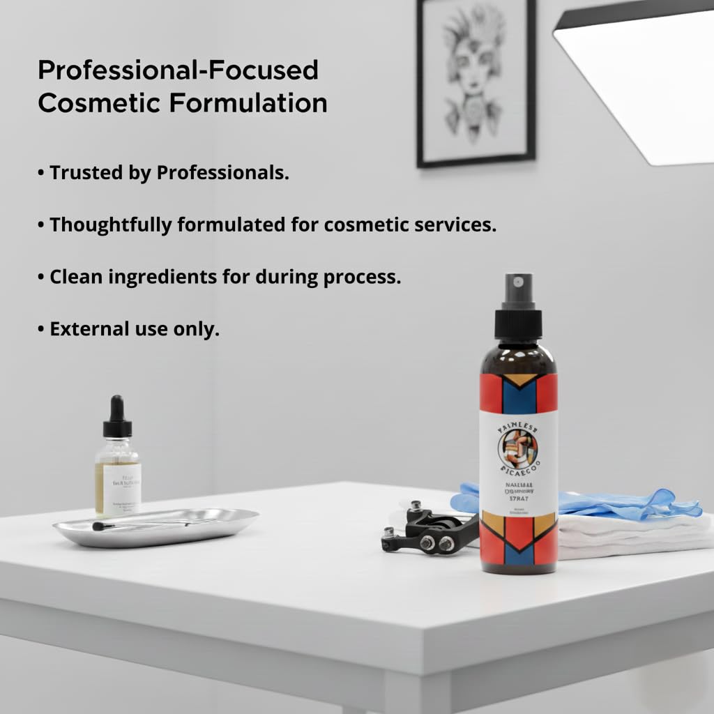 Painless Picasso Skin Conditioning Spray is a plant-based cosmetic-use spray designed for application during cosmetic process. The lightweight mist applies evenly and absorbs quickly, helping maintain a conditioned skin feel throughout tattooing, waxing, and aesthetic services. Formulated without unnecessary additives and intended for external cosmetic use only.