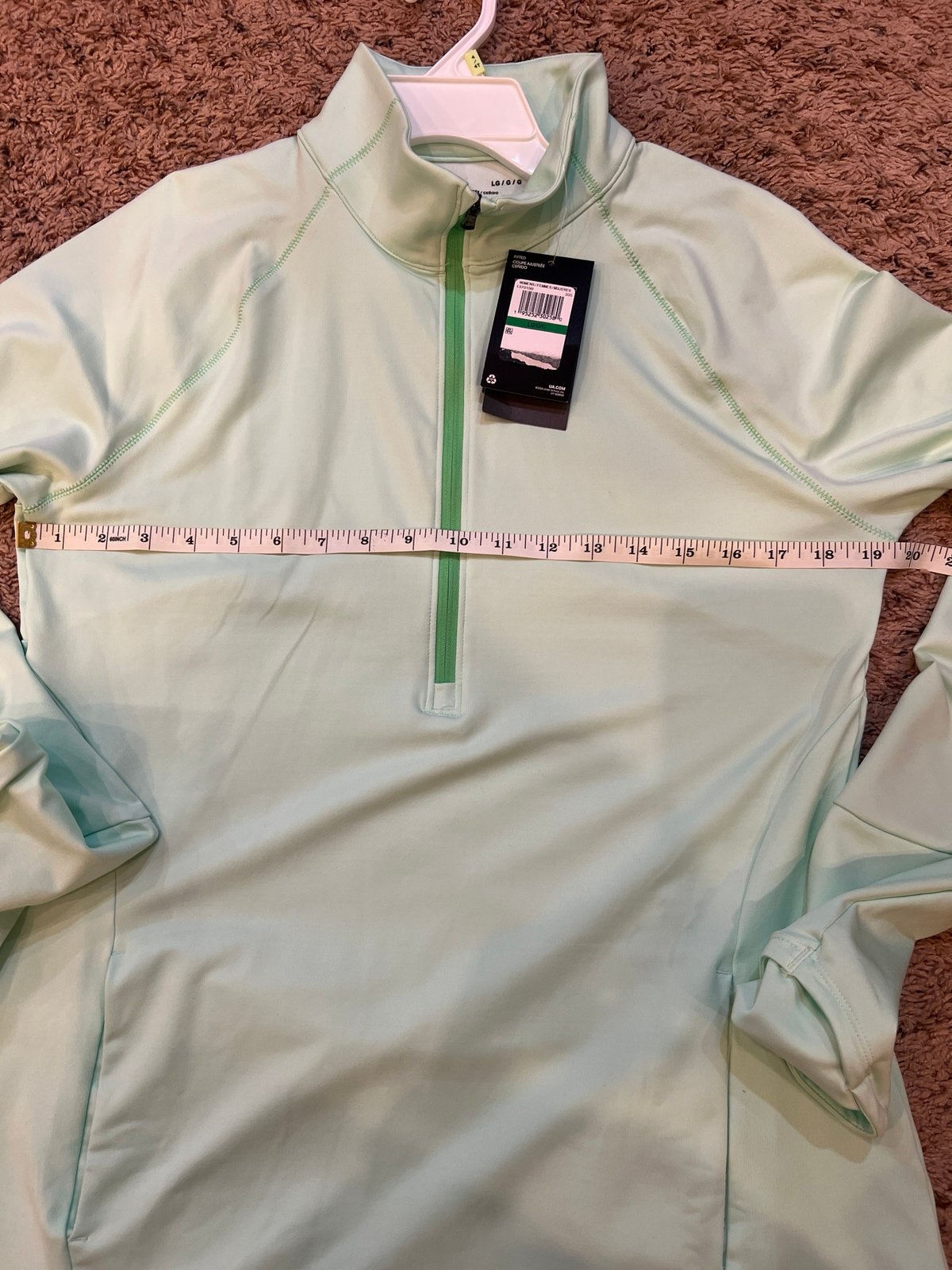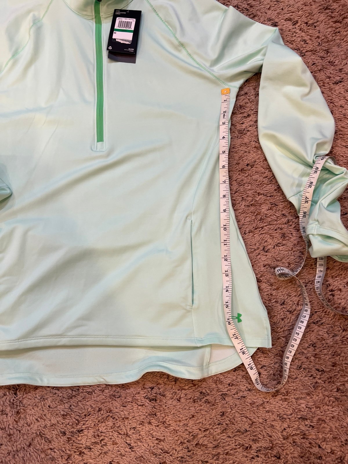 NWT Under Armour Fitted 1/2 Zip, size large. This feels lightweight yet is from the cold gear collection. It’s fitted and looks longer than normal so would look great with leggings. It is a light mint or key lime color though it appears a little lighter in the pictures. It’s a tiny bit wrinkled from being in my closet!