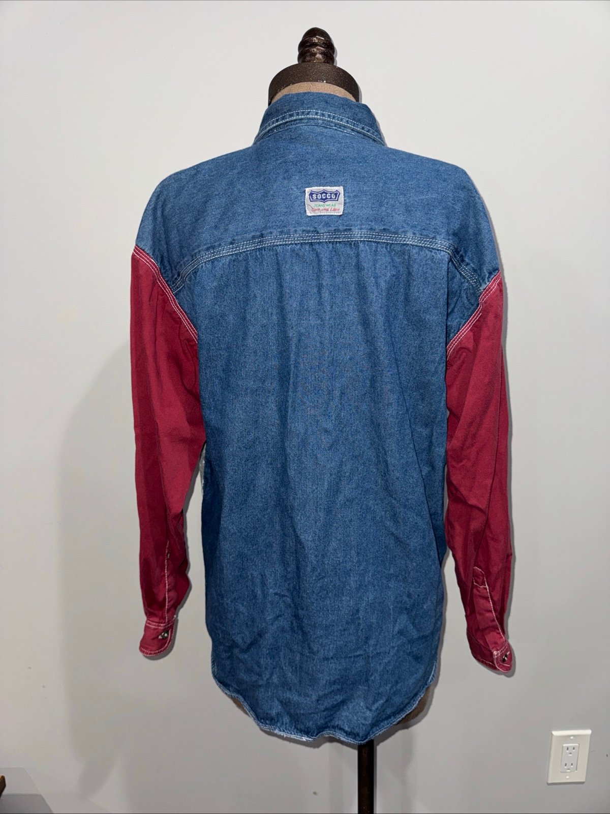 The Vintage 90s Socco Cotton Denim Floral Long Sleeve Button Down Shirt in size M is a stylish and unique addition to any woman's wardrobe. Made from comfortable cotton denim, this top features a floral pattern that adds a touch of femininity to the classic Western-inspired design. The button-up style and long sleeves make it perfect for a casual yet chic look, while the retro 90s theme gives it a nostalgic feel. Ideal for pairing with jeans or dressed up with a skirt, this shirt is a versatile and eye-catching piece that will stand out in any collection.