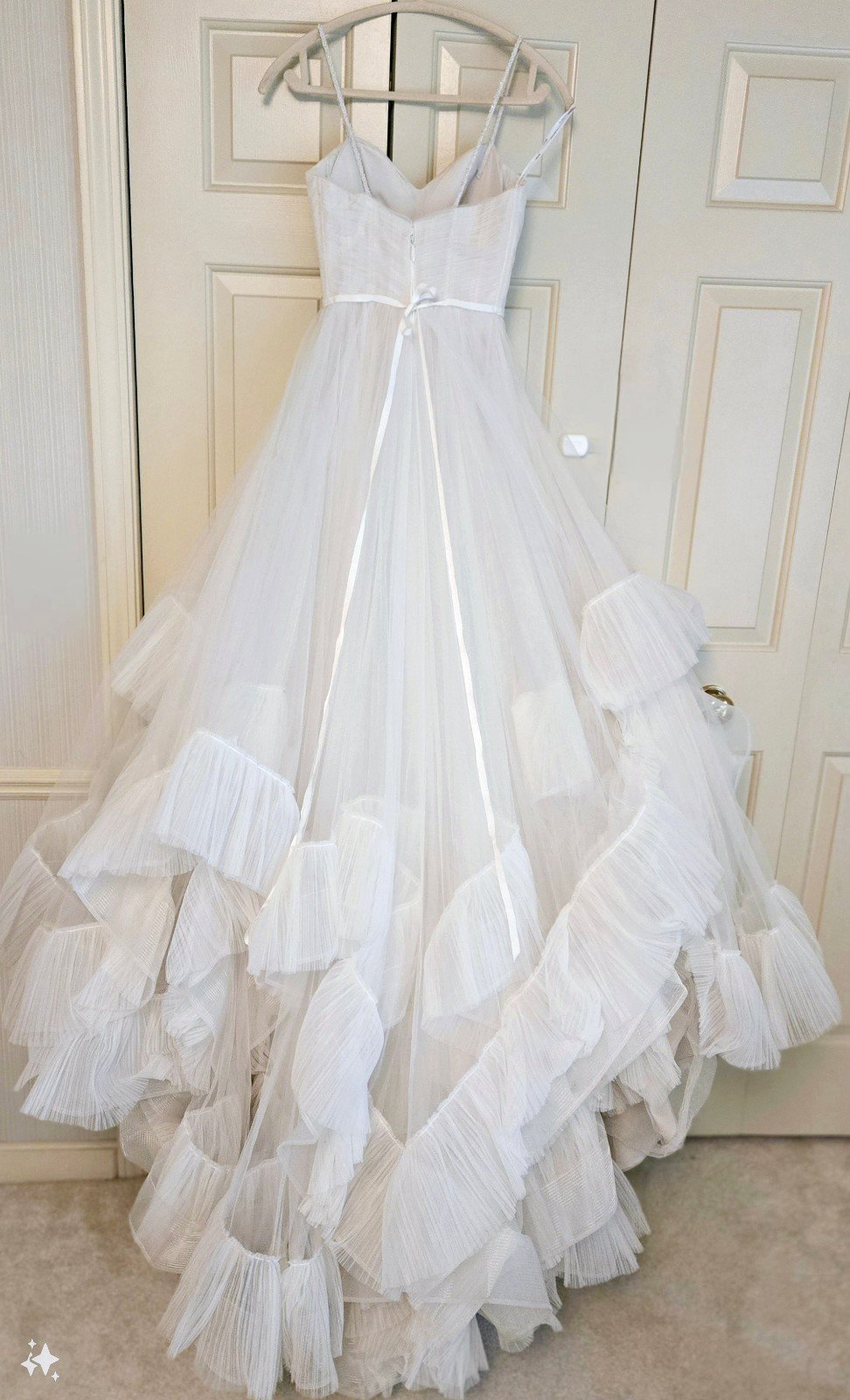 Gorgeous ivory wedding dress. Minor areas noted on the underlining of the dress (see photos), which happened during photos outside. Small pull and tear on tulle underneath,these areas are not visible while wearing dress. Also few tiny beads missing on one strap. Hair pin veil included and in perfect condition.